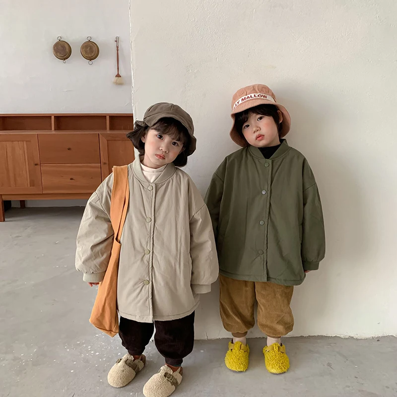 Куртка на хлопковом наполнителе для мальчиков и девочек, Осень-зима 2021, Повседневная бейсбольная форма, Детское пальто, плотная теплая однотонная детская верхняя одежда