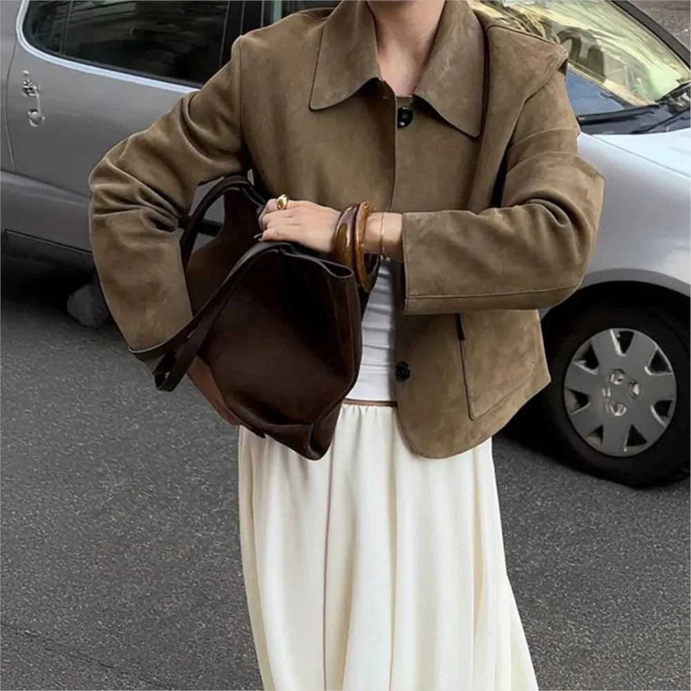Куртки в стиле ретро, женские элегантные однобортные коричневые пальто с лацканами, женские осенне-зимние модные мягкие карманные верхняя одежда 2024, женская одежда