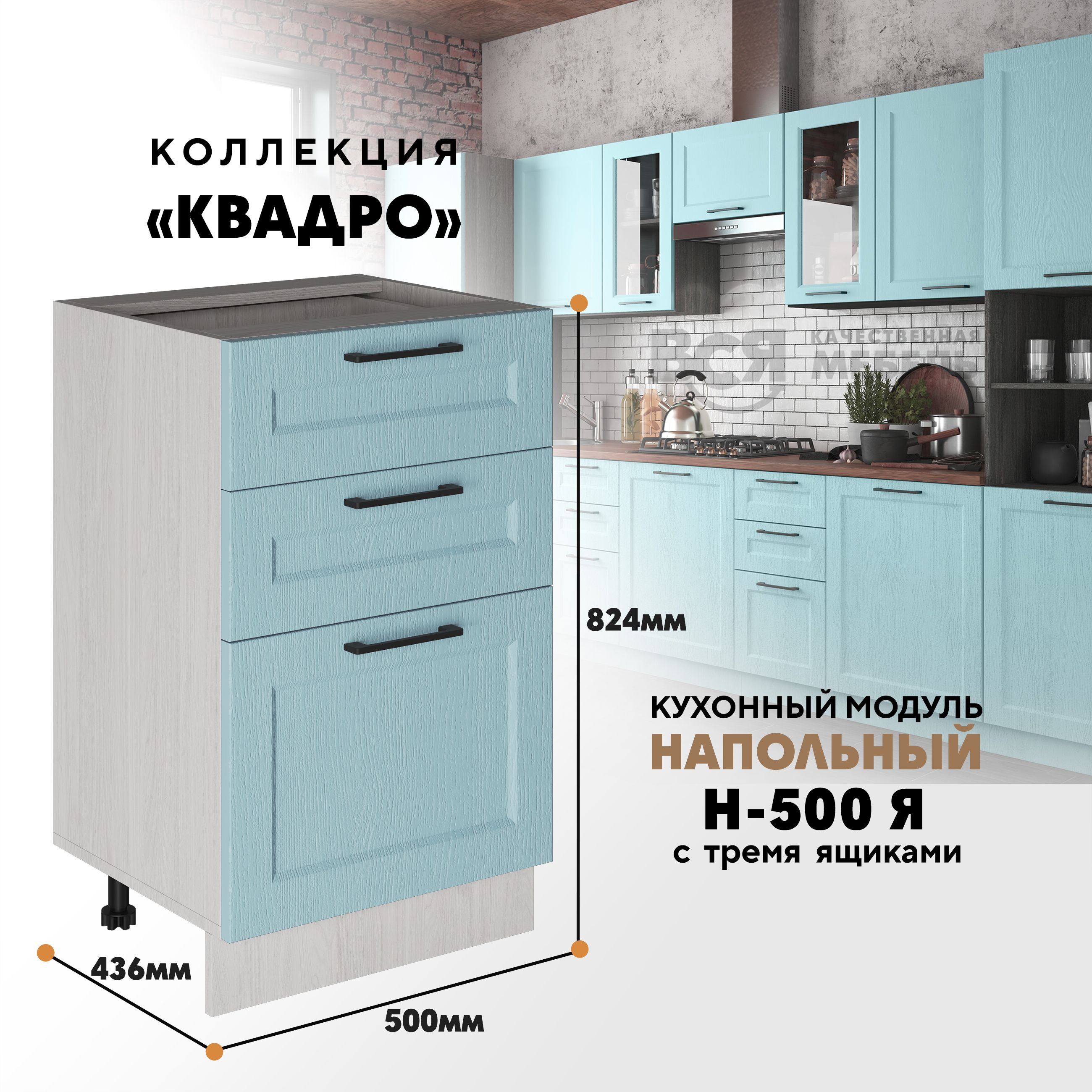 Н-500Я - напольный модуль для кухни из модульной программы "Квадро", оснащен тремя ящиками, в которых удобно хранить столовые приборы, посуду, продукты или кухонную технику. Ультра модный стиль «Квадро» - это настоящий французский шарм, это эффектное современное дизайнерское направление. Коллекцию отличает «деревенский» дизайн: мягкие формы без нарочито грубых деталей и некоторая старомодность. Особенность кухонной модульной программы использование оригинальной фурнитуры «под старину», с тусклым блеском металла, и навесных ящиков с карнизами и стеклянными дверцами, стилизованными под «окна» деревенского дома. Фактурные фасады выполнены из МДФ.