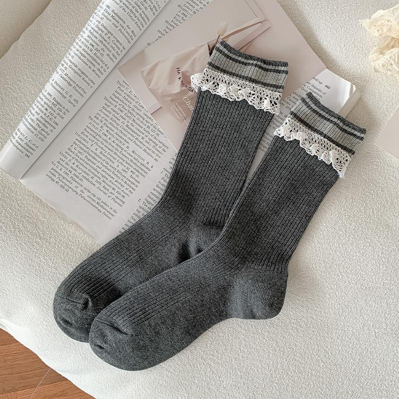 Куча кружева Кружевные носки до середины икры для весны и осени, Женские спортивные полосатые милые длинные носки до икры 1 pair темно-серого