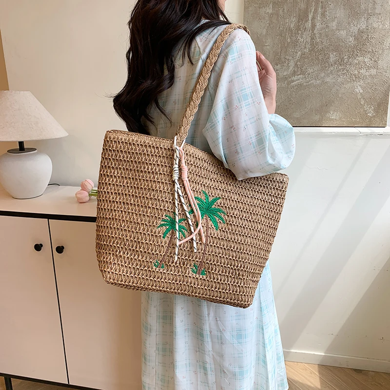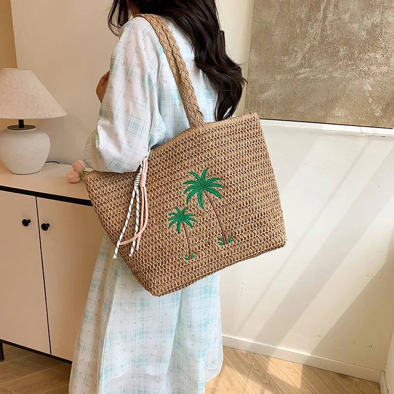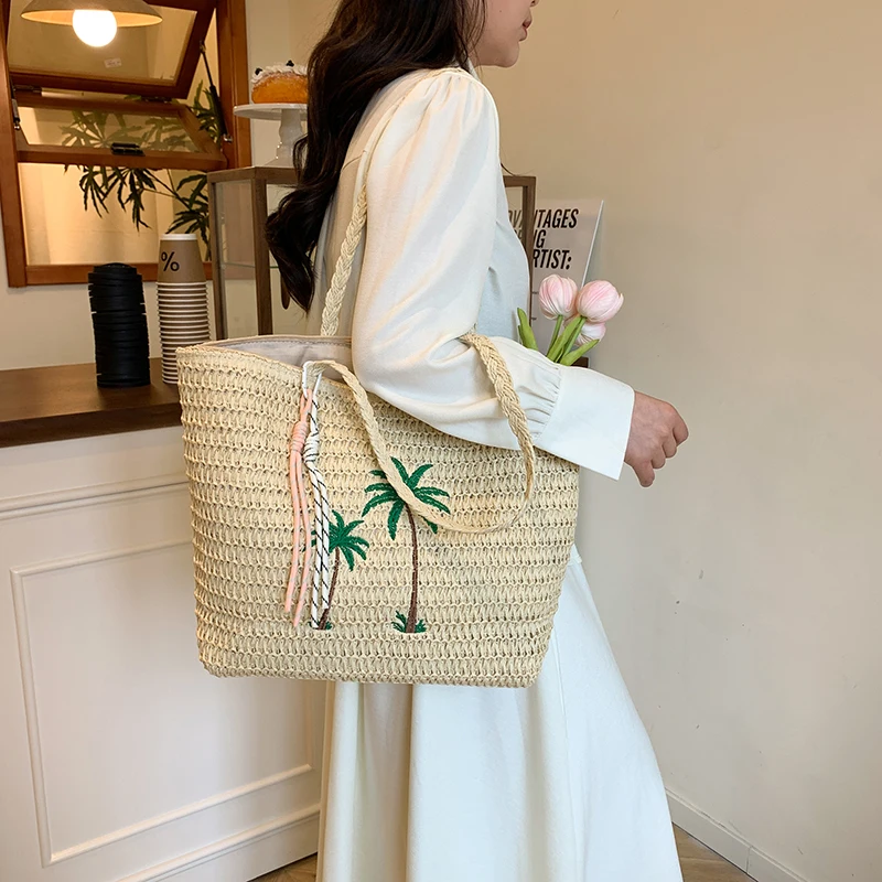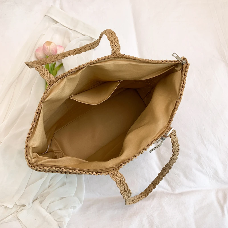 Левая сторона, летняя соломенная вязаная сумка, тканая большая сумка, однотонная пляжная сумка на плечо, 2025 год, праздничная дорожная сумка, кошелек на плечо для женщин