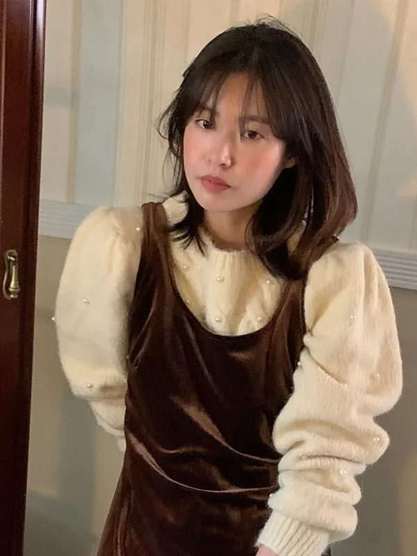Chic Vintage round Ne Knitted Sweater Long Sve Women's Faion Pearl Embellied Velvet Fabric Spring Autumn Season