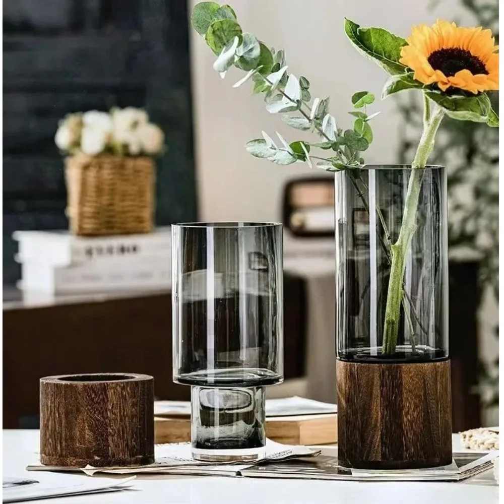 Легкая роскошная стеклянная ваза с деревянным основанием, толстая полосатая цилиндрическая ваза для цветов, большая вместительная питательная ваза для воды, украшение дома