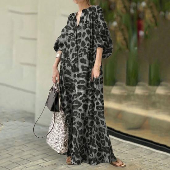 Леди платье макси с леопардовым принтом и воротником-стойкой, большие размеры, с половиной рукавом, в богемном стиле, повседневное длинное осенне-весеннее платье