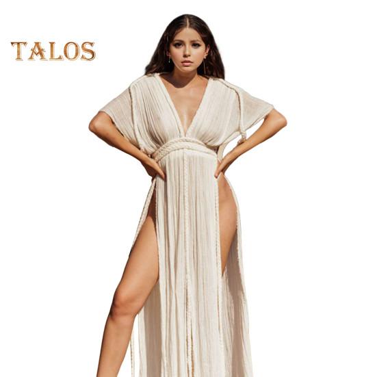 Леди пляжное платье макси с глубоким вырезом и V-образным вырезом с короткими рукавами и разрезом на подоле Плиссированные шнуровки Декор витой веревки Высокая талия Сплошной цвет Длинное бикини белый