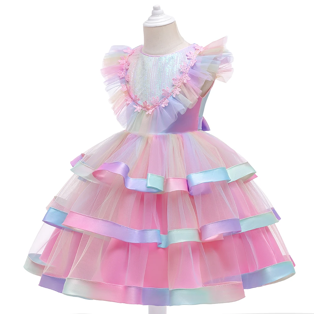 Летнее Радужное платье для девочек, сетчатые марлевые платья с цветочным принтом для детской вечерние ринки, свадьбы, платья принцессы, дет...