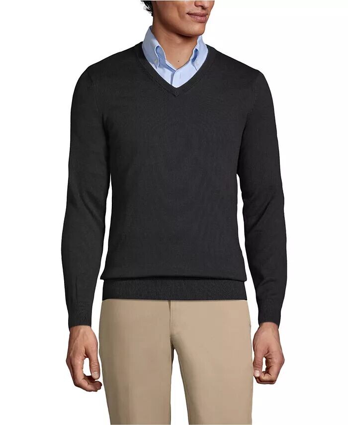 Школьная форма мужской хлопковый модал тонкий свитер с V-образным вырезом Lands' End, черный