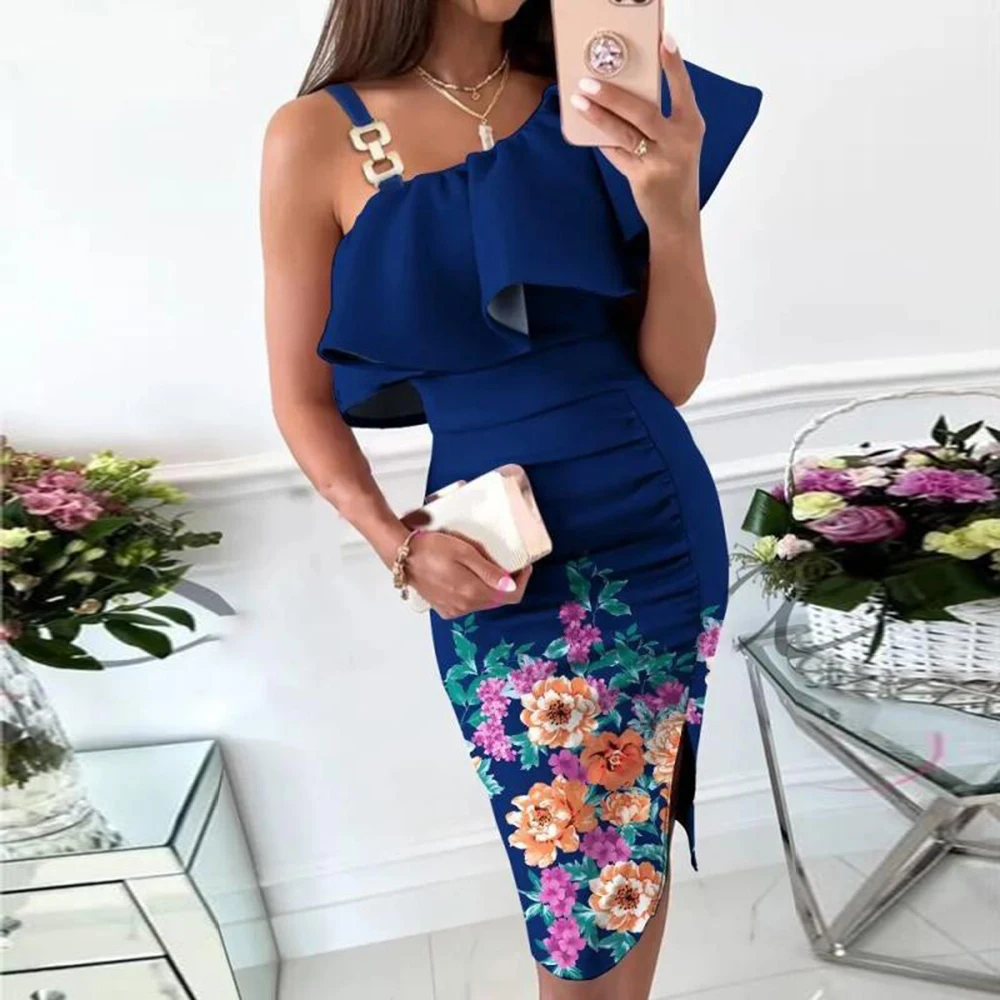 Летнее вечерние ное вечернее платье на одно плечо с оборками, элегантные плиссированные платья миди с косым воротником и разрезом, модное ж...