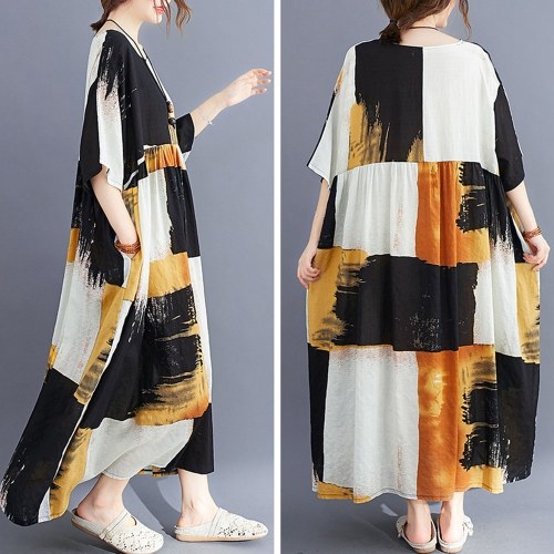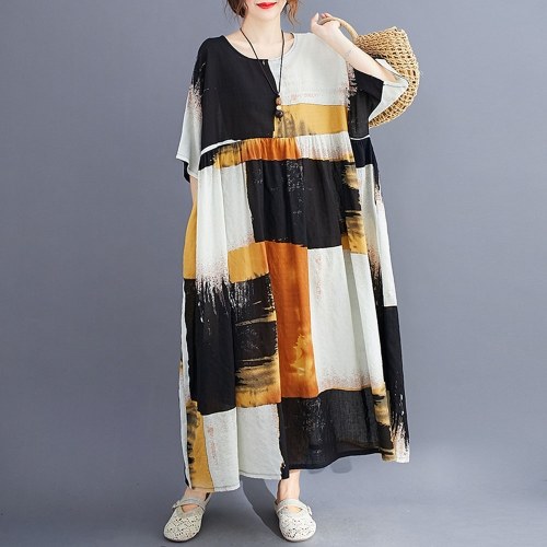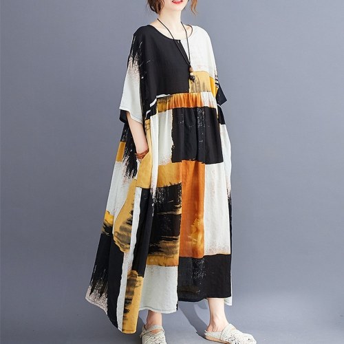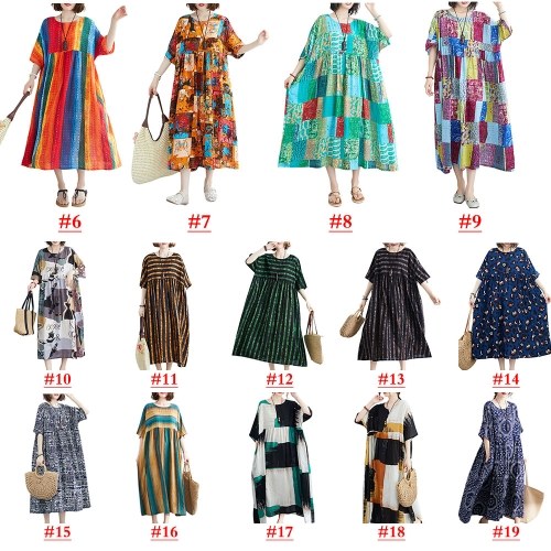 Летнее винтажное женское хлопковое льняное платье с принтом в полоску с круглым вырезом и коротким рукавом с карманным свободным платьем