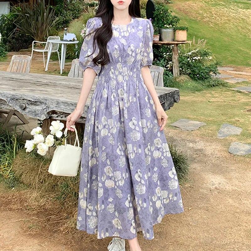 Летнее винтажное облегающее платье с принтом во французском стиле, элегантное с коротким рукавом и эластичной резинкой на талии, фиолетовые женские платья, женские вечерние платья M фиолетовый
