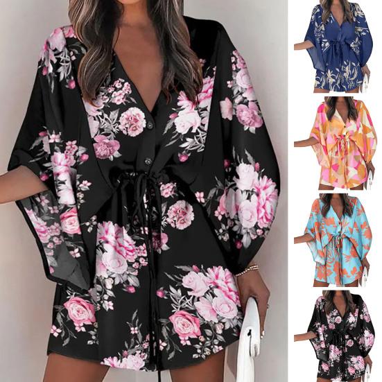 Летнее женское мини-платье с v-образным вырезом и коротким рукавом с цветочным принтом на талии и пляжным праздничным платьем