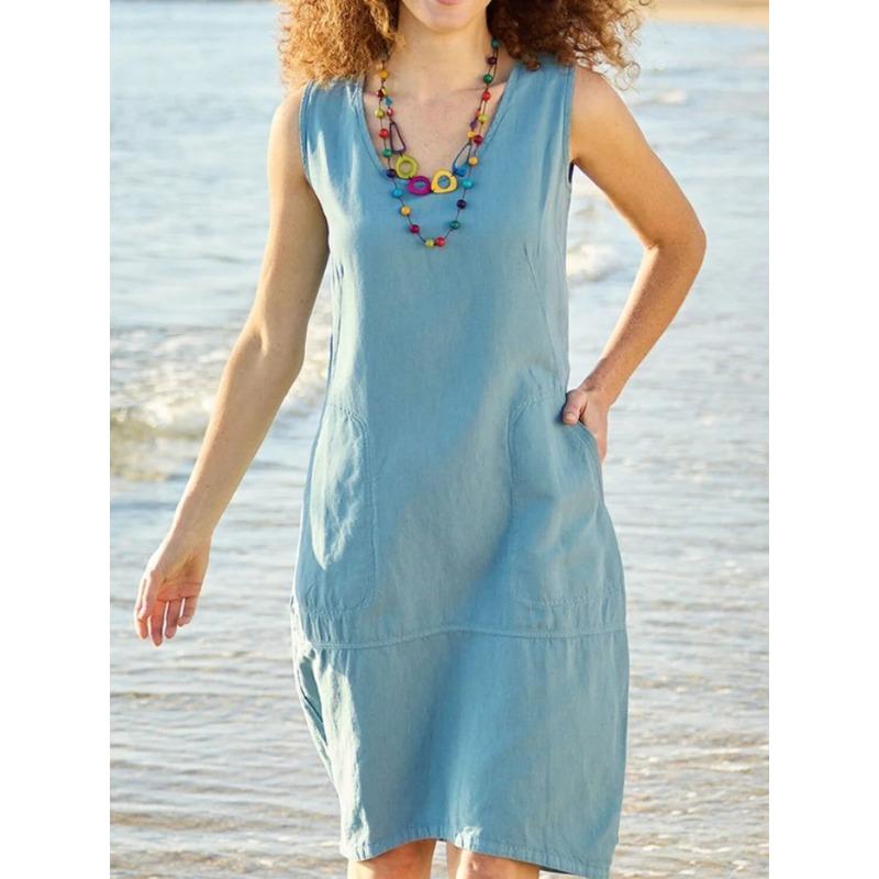 Летнее женское платье больших размеров, однотонное хлопково-льняное платье миди без рукавов с U-образным вырезом и карманами 2XL светло-синий