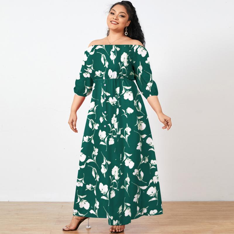 Летнее женское платье макси с открытыми плечами и цветочным принтом, рукавами-фонариками, большие размеры FZH