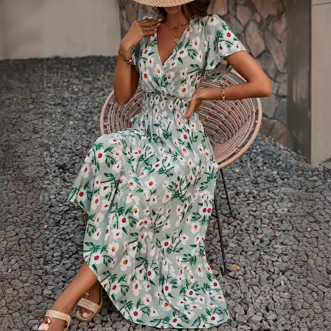 Летнее женское платье с v-образным вырезом и короткими рукавами, длинное платье, модные темпераментные платья с большой талией XL