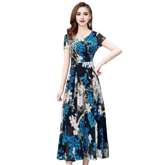 Летнее женское платье трапециевидной формы с цветочным принтом, большой подол, высокая талия, короткие рукава, круглый вырез, плиссированное платье до середины икры, официальное вечернее платье миди для поездок на работу 2XL синий