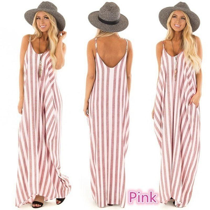 Летнее женское полосатое длинное платье макси, женские повседневные пляжные платья без рукавов от солнца XL розовый
