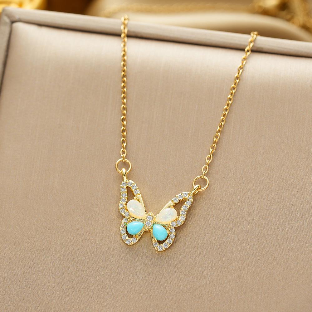 Летнее красочное ожерелье с бабочкой: Не тускнеющая титановая стальная цепочка для ключицы золотой/синий