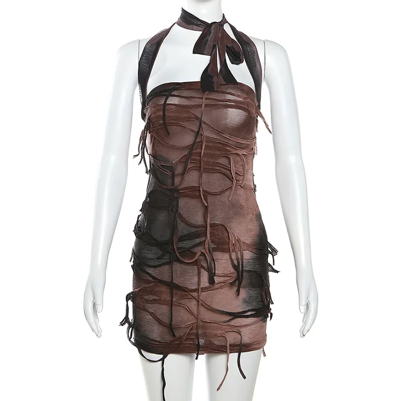 Летнее мини-платье с лямкой на шее, женское винтажное ретро с открытой бахромой, тонкое сексуальное облегающее платье y2k, колье с открытой спиной, вечерние рваные платья