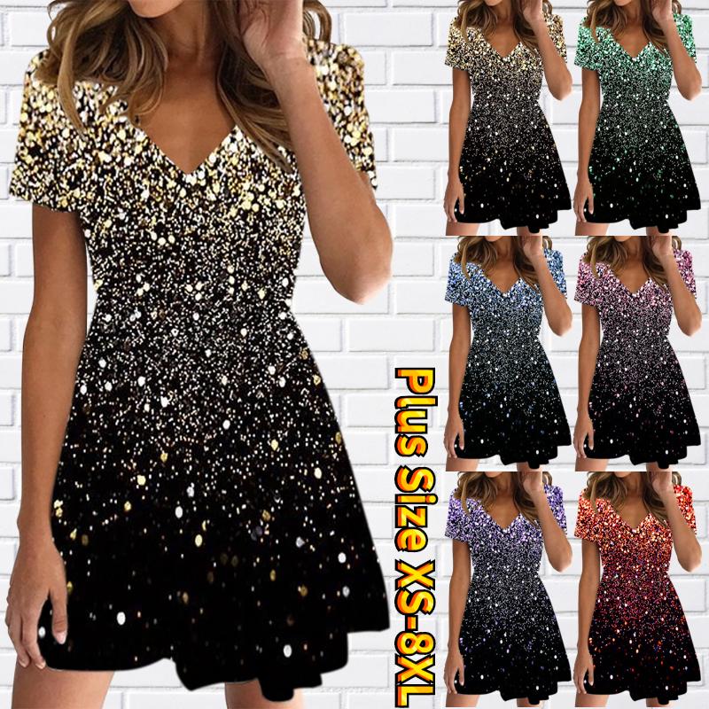 Летнее модное женское платье с v-образным вырезом и коротким рукавом с блестками и принтом, сексуальные короткие юбки, платья