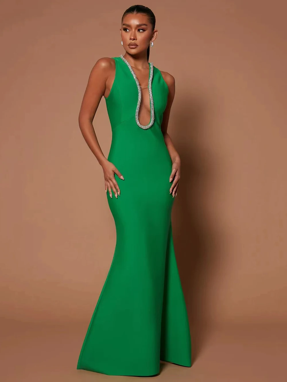 Летнее модное женское сексуальное длинное облегающее Платье макси с V-образным вырезом, со стразами, зеленое, черное, красное, с юбкой-годе, 2023 элегантное вечернее Клубное платье