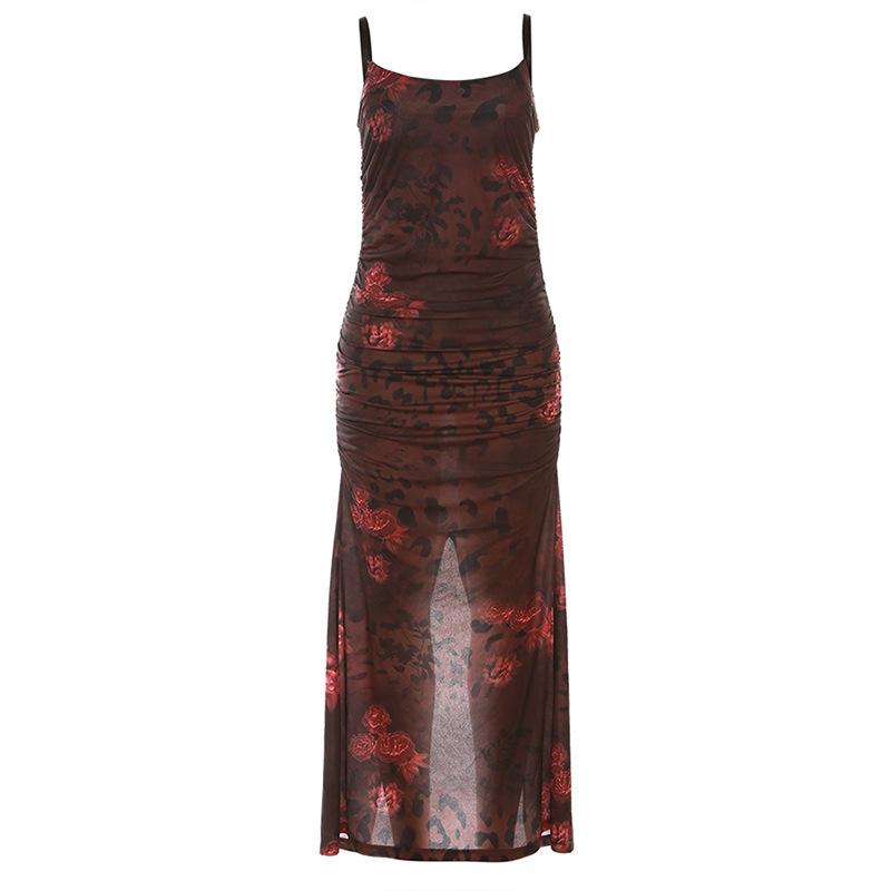 Летнее новое женское модное платье-слинг, облегающее, с ретро-принтом, с разрезом, облегающее бедра, темпераментное M темно-коричневого