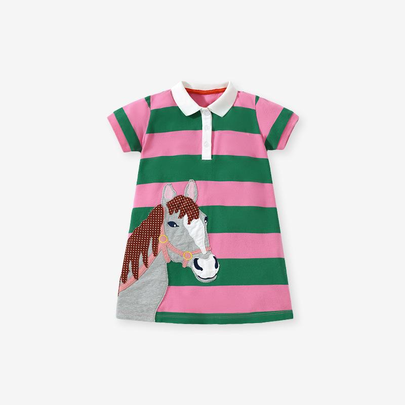 Летнее платье в полоску контрастного цвета с короткими рукавами и воротником с лацканами для маленьких девочек, юбка с вышивкой в виде лошади 80cm розы красного
