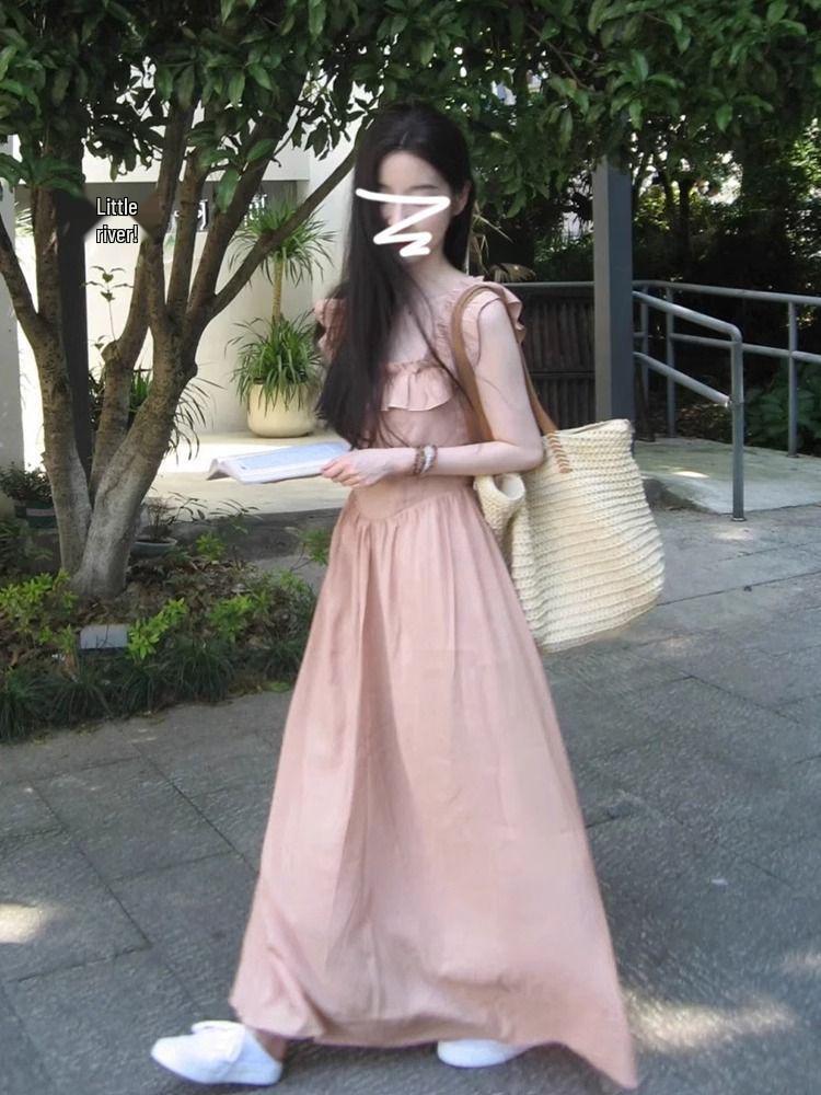 Летнее платье в французском стиле с оборками, квадратным вырезом и бретелями-спагетти - Женская элегантная одежда для отпуска XL розовый