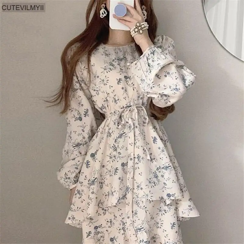 Летнее платье для девочек из шифона с цветочным принтом, женское платье-миди 2021 новый корейский цельный Винтаж в ретро-стиле с круглым вырез...