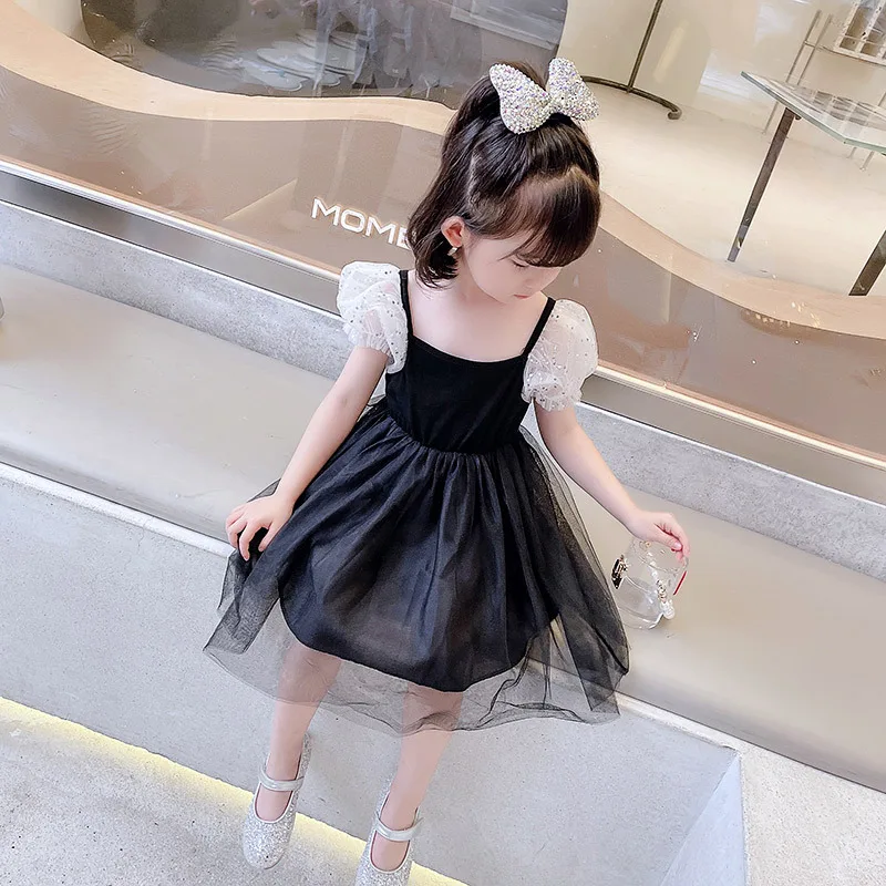 Летнее платье для девочек 2021, летнее милое платье со звездами, с коротким рукавом, черная сетчатая юбка, милое ТРАПЕЦИЕВИДНОЕ милое платье п...