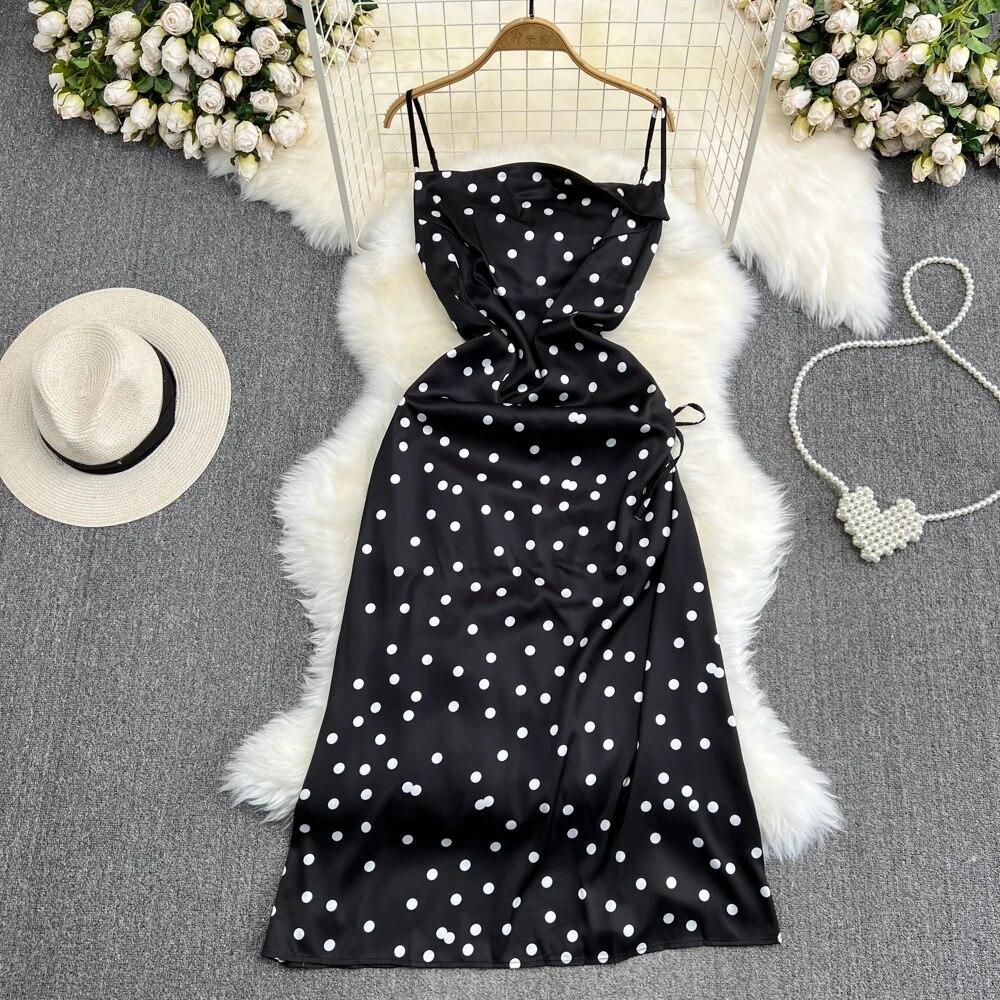 Летнее платье для женщин с тонкой талией, без рукавов, халат на бретельках Femme 2024, модные платья в горошек на шнуровке One Size чёрный