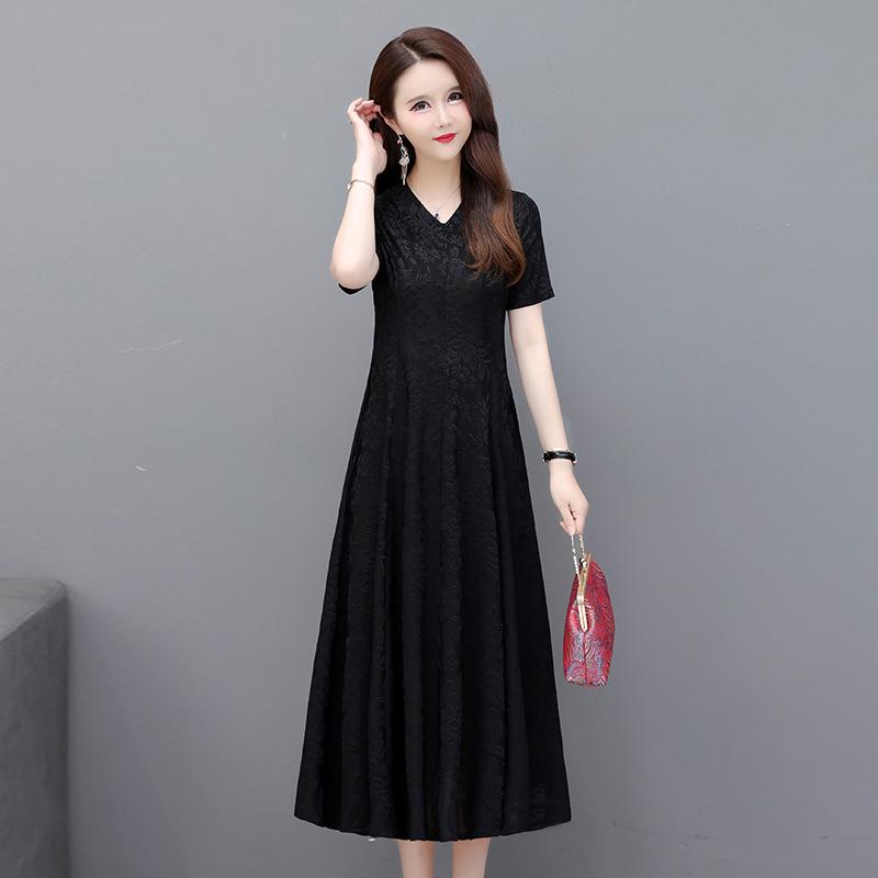 Летнее платье из модала с коротким рукавом для мам - Миди, Большой размер, Приталенное, Большой клёш, Длинное платье. 4XL (for 130-140 jin) чёрный