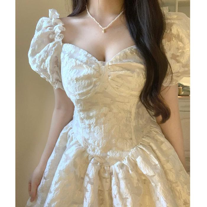 Летнее платье с квадратным вырезом и пышными рукавами для женщин - Сладкое, пикантное и стройнящее платье в стиле принцессы M грязно-белый