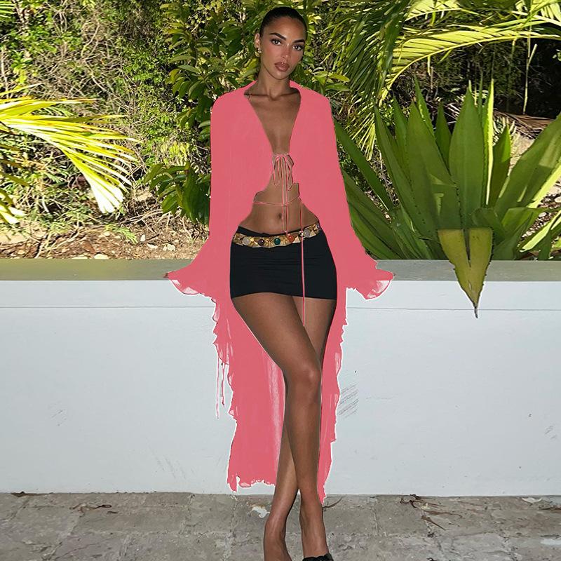 Летнее сексуальное сетчатое прозрачное платье, новое элегантное расклешенное платье с длинными рукавами и повязкой на шнуровке, открытые вечерние пляжные платья с рюшами и длинными рукавами, женские 247 L розовый