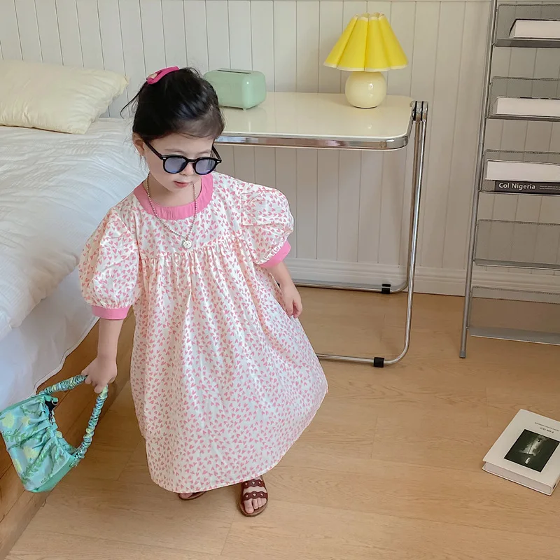 Летнее хлопковое тонкое платье с принтом сердечек для маленьких принцесс, повседневные платья с пышными рукавами