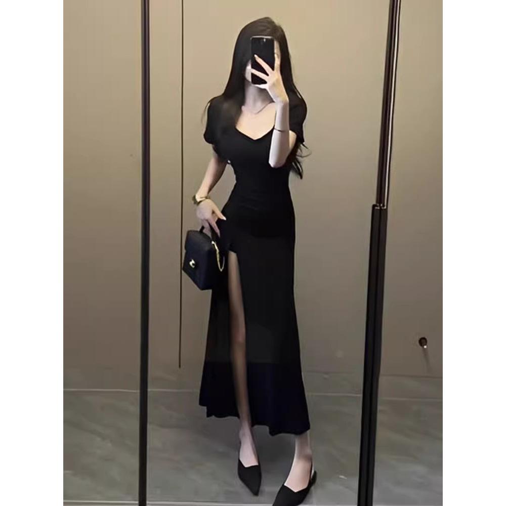 Летнее черное облегающее платье с разрезом в стиле Spicy Girl - Элегантное и универсальное платье во французском стиле Medium
