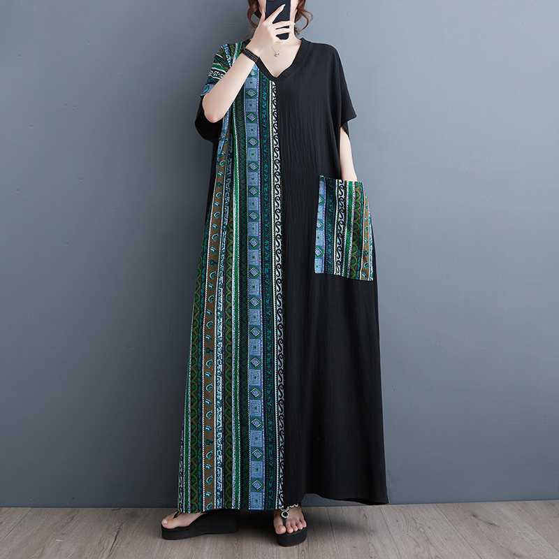 Летние винтажные платья в стиле колор-блок, длинные, с большими карманами, с V-образным вырезом, женские платья One Size