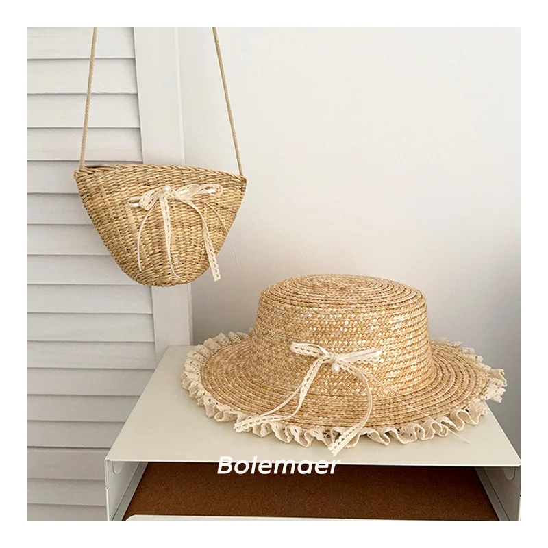 Летние детские шляпы, сумки, новая детская соломенная шляпа, сумка из двух предметов, милая пляжная шляпа с бантом, лесная серия, шапки с травой для маленьких девочек