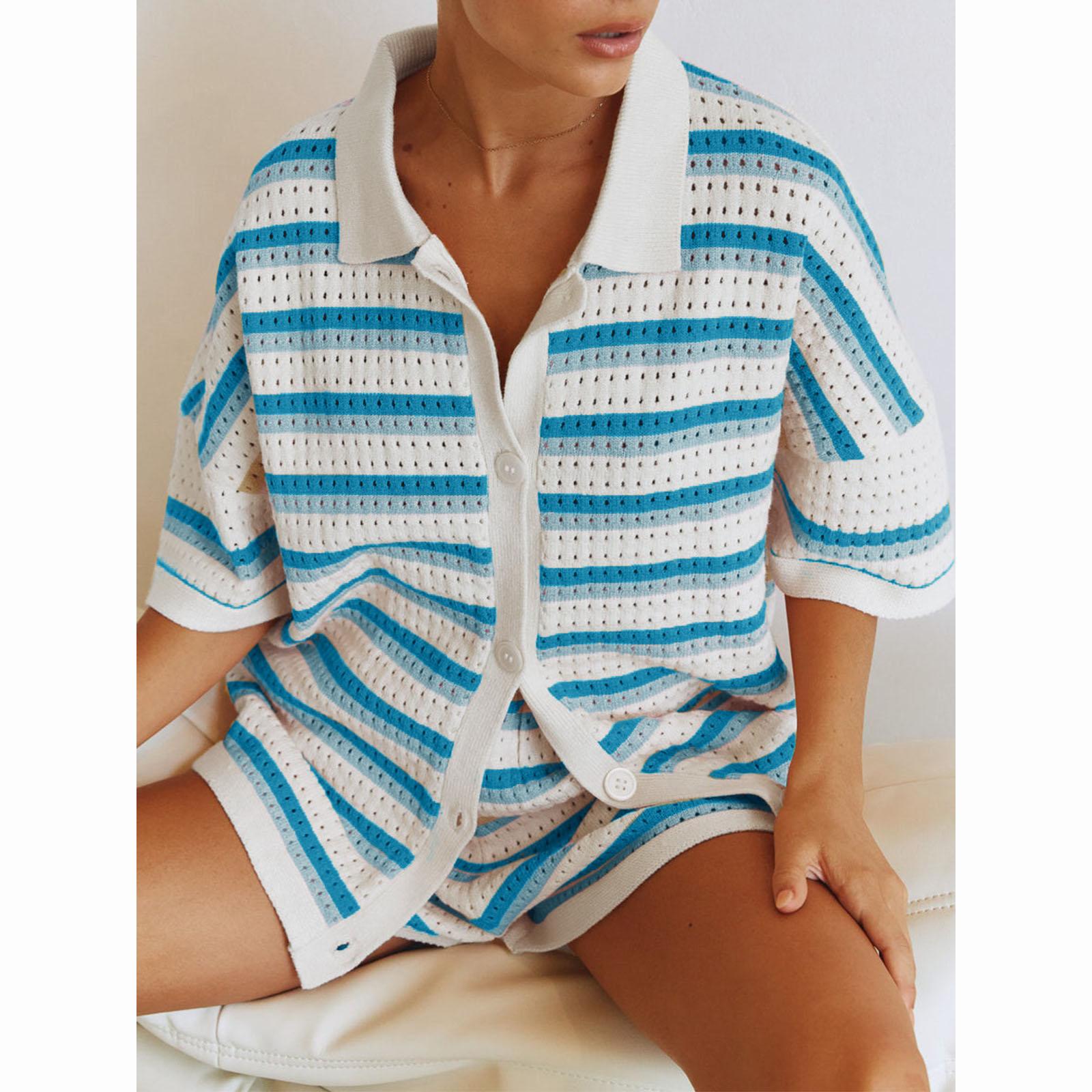 Летние женские комплекты из двух частей, шорты, блузки, полосатые пуговицы, вязаные крючком топы и шорты, подходящие комплекты XS