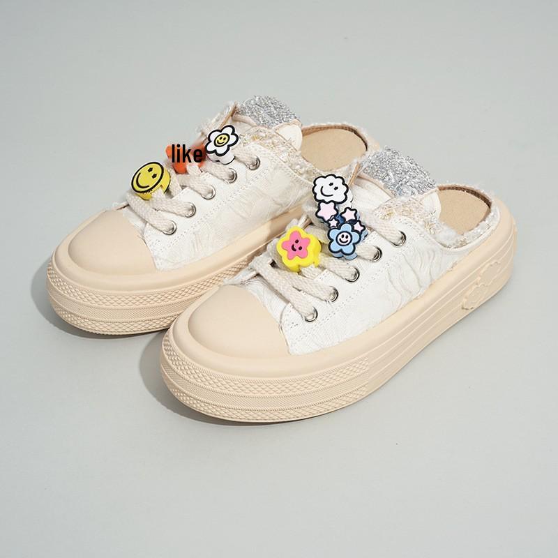 Летние женские парусиновые полушлепанцы с цветочным декором из страз, на толстой подошве и с закрытым носком, 2024 35 грязно-белый