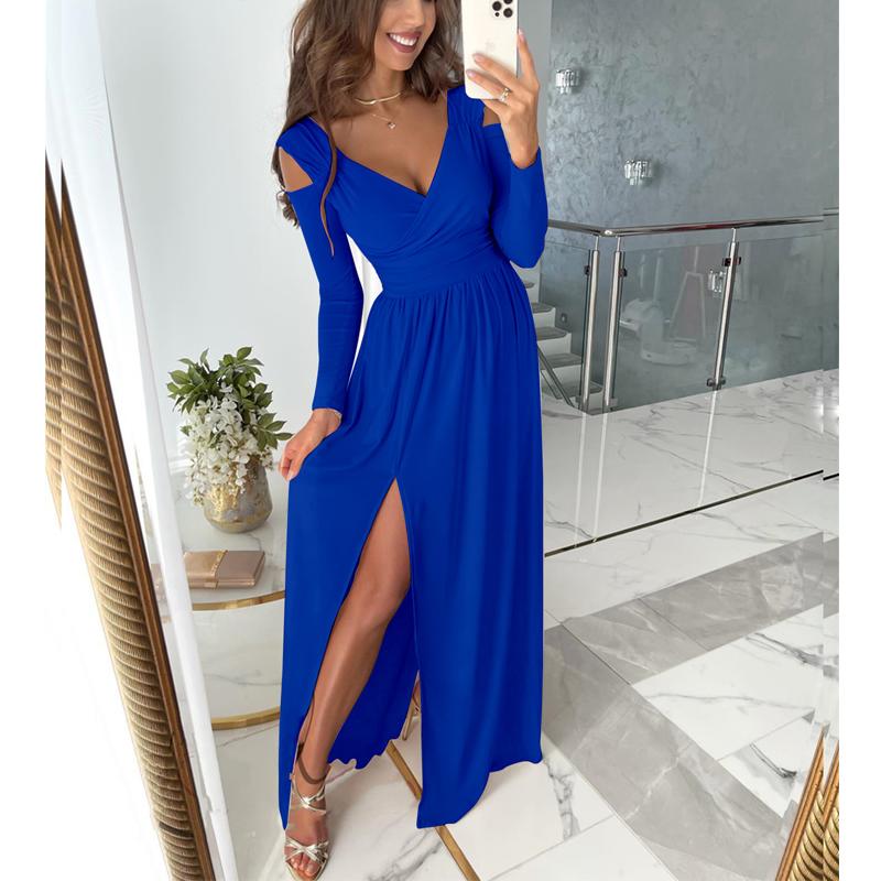 Летние женские платья, сексуальное длинное платье с v-образным вырезом и длинными рукавами, элегантное платье с открытыми плечами, платье с разрезом, платья с высокой талией, вечернее платье XL синий