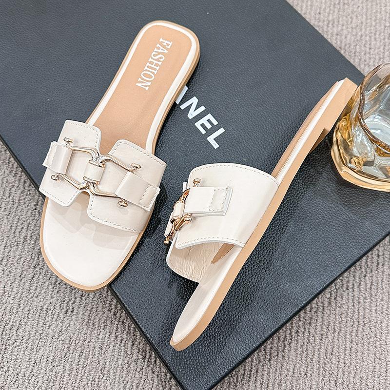Летние модные шлепанцы в европейском и американском стиле на плоской подошве для отдыха с пряжкой, темпераментные однолинейные тапочки для женщин
