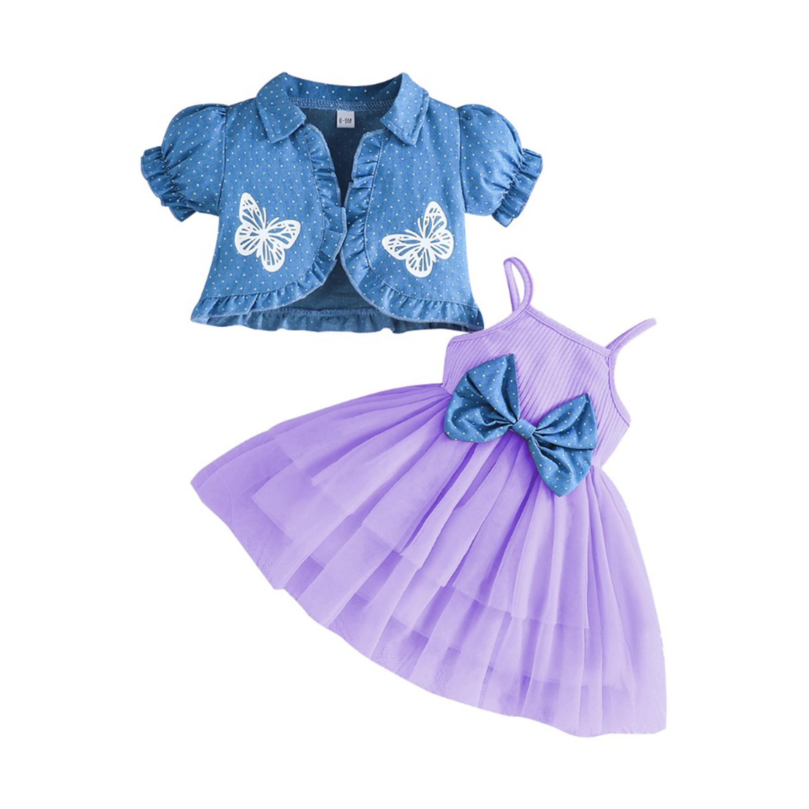 Летние наряды для девочек-малышей, платье-трапеция из тюля с тонкими бретельками, бантом, принтом бабочек в горошек, короткий кардиган с рукавами-фонариками 9-12 Months