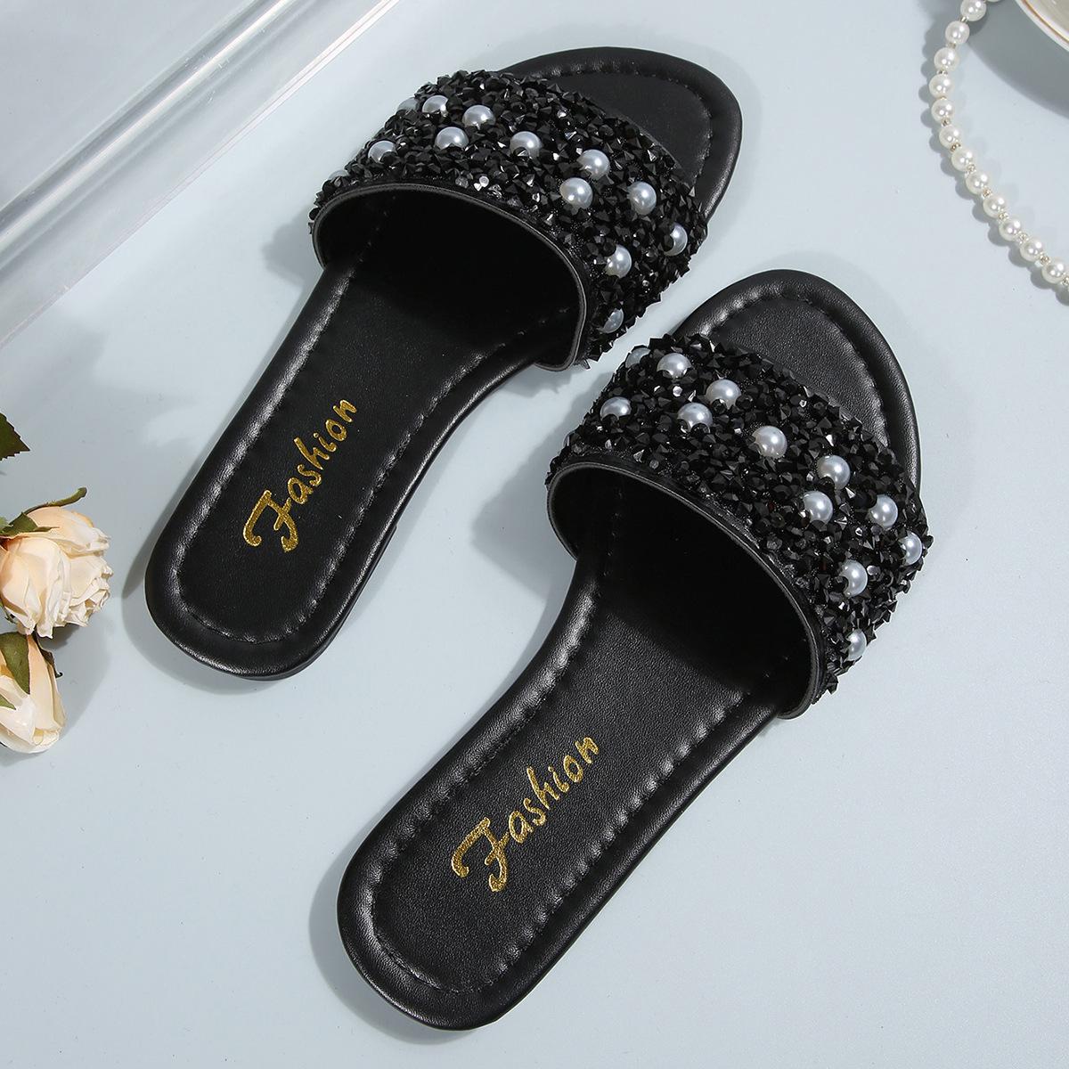 Летние новые блестящие шлепанцы с квадратным носком и открытым носком, женские модные универсальные жемчужные сказочные шлепанцы на плоской подошве, крутые шлепанцы 35 чёрный