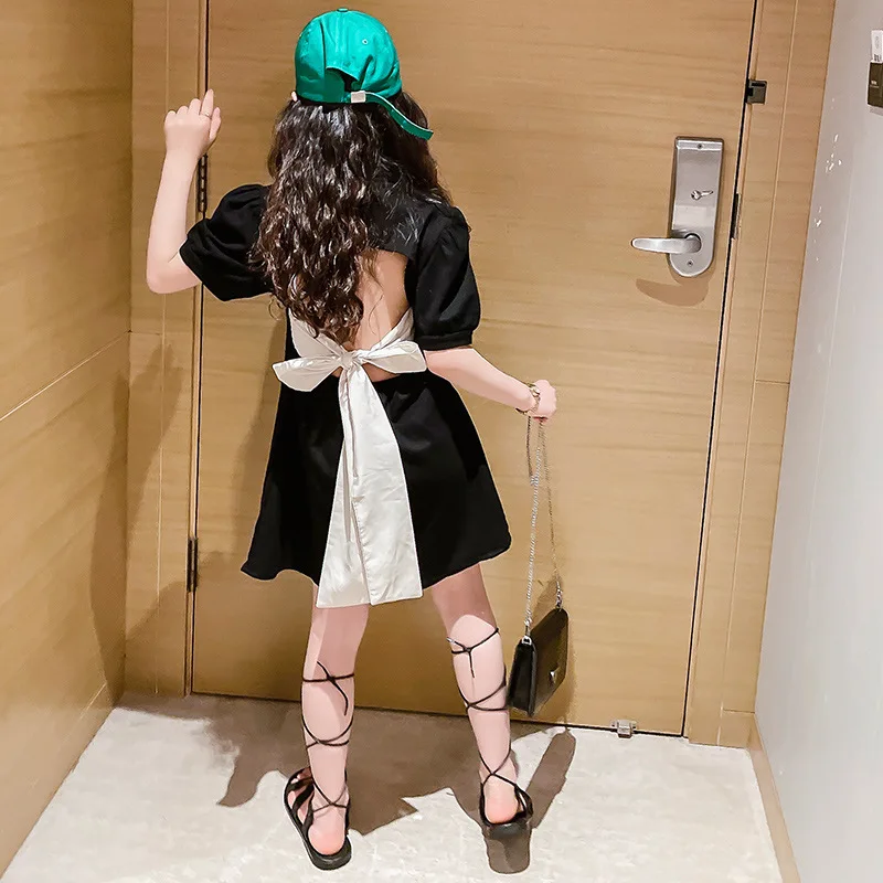 Летние платья для девочек, черное праздвечерние чное платье с бантом для девочек, спортивное Повседневное платье с вырезами на спине, одежд...