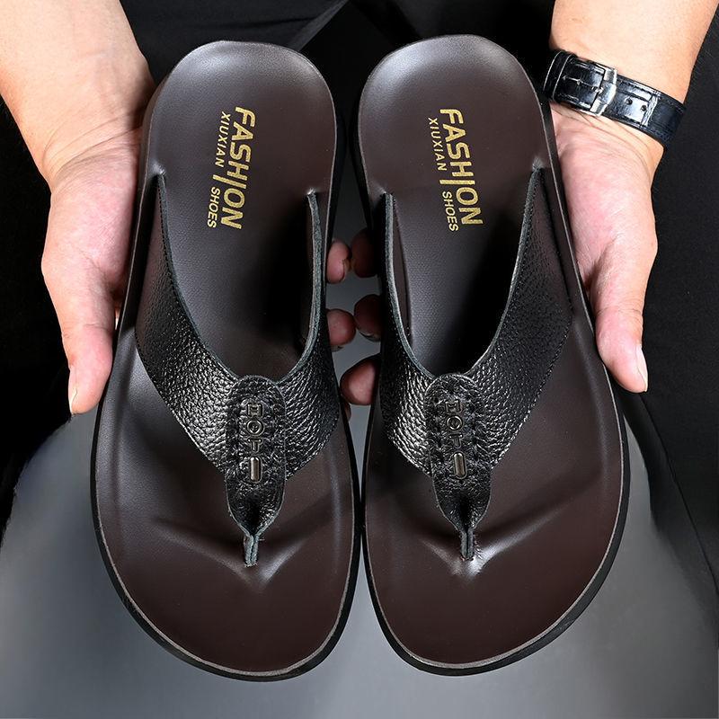 Летние сандалии мужские шлепанцы повседневная пляжная обувь кожаные дышащие домашние нескользящие тапочки 40 чёрный