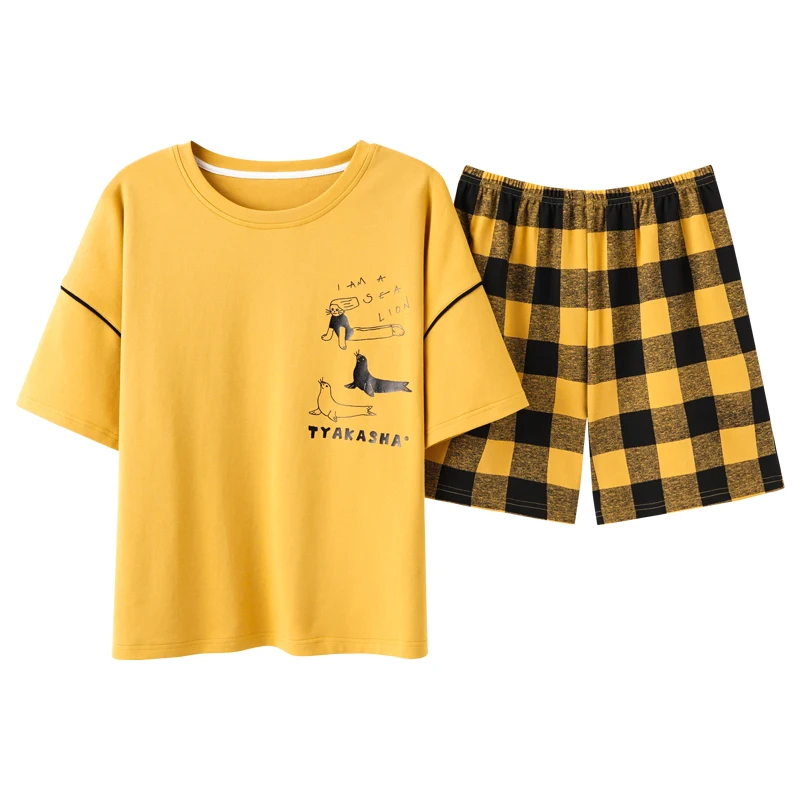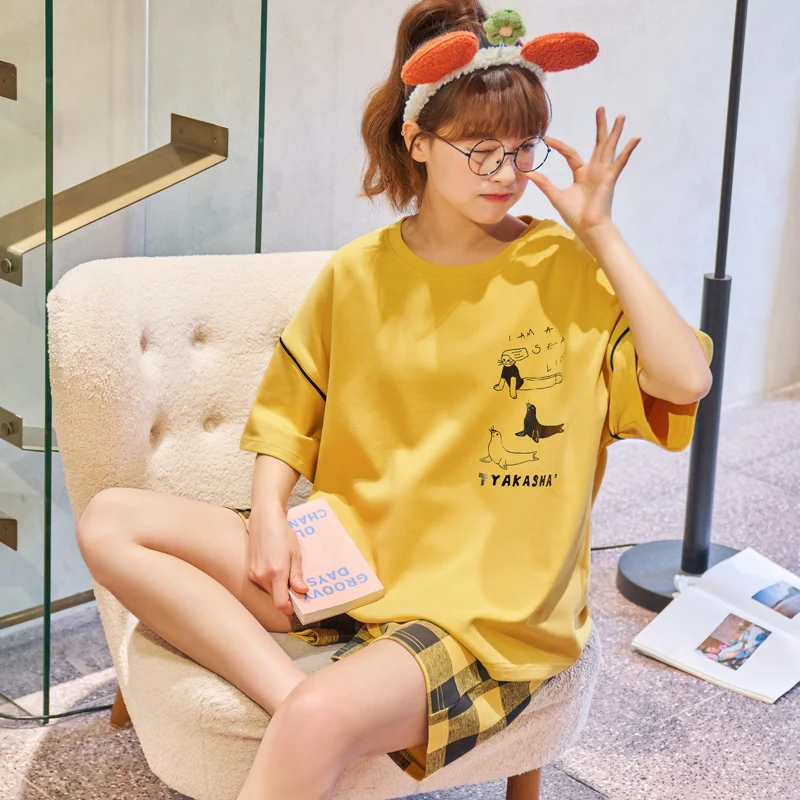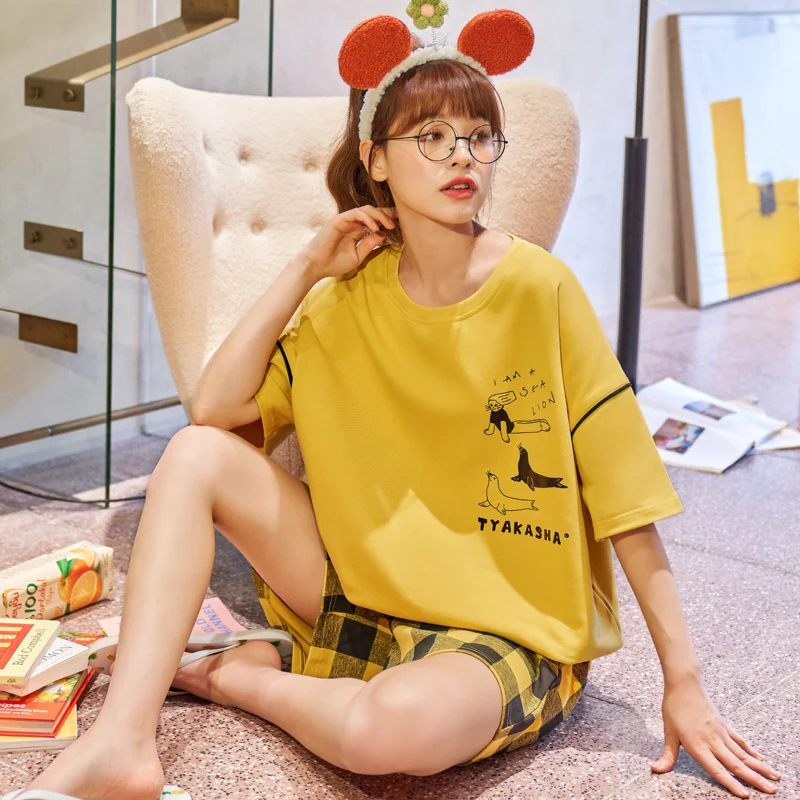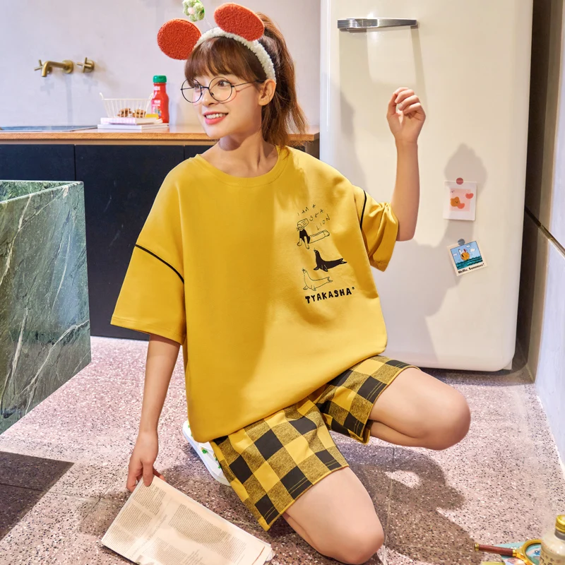 Летняя Корейская желтая Пижама с героями мультфильмов для женщин, хлопковая Свободная Домашняя одежда с круглым вырезом, клетчатая Милая П...