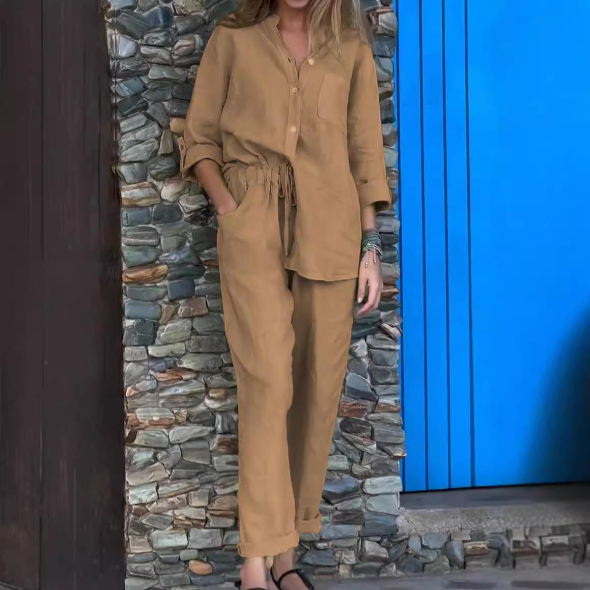 Летняя Мода Сочетающаяся Коллекция Женский Свободный Комплект из Хлопка и Льна Однотонный Комплект Однобортный Топ Брюки с Широкими Штанинами XXL хаки