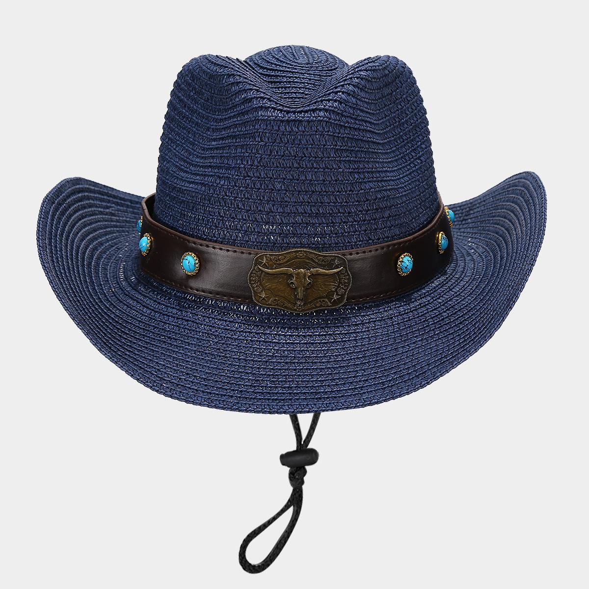 Летняя женская европейская и американская соломенная шляпа с украшением в виде головы быка в стиле вестерн, солнцезащитная шляпа для отдыха на природе с загнутыми полями, мужская шляпа от солнца one size тёмно-синий
