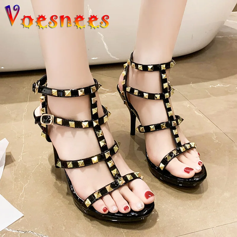 Летняя женская обувь с узким ремешком в римском стиле, вечерние туфли-лодочки 10 см, сексуальная модель в стиле ретро, туфли на высоком каблуке с металлическими заклепками, повседневные прогулочные сандалии