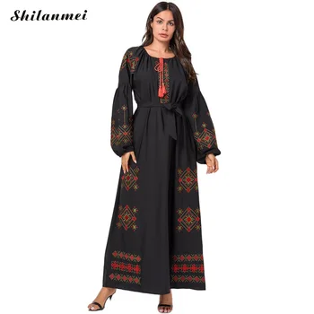 Women Embroider Long Sleeve Maxi Vestidos With Belt Plus Size Long Cotton Robe Elegant Lantern Sleeve Retro Party Dresses 4xl